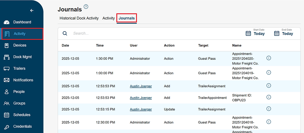 The Journals page displays user changes and access commands made from the website. Below you can find a walkthrough of how to navigate the Journals tab.